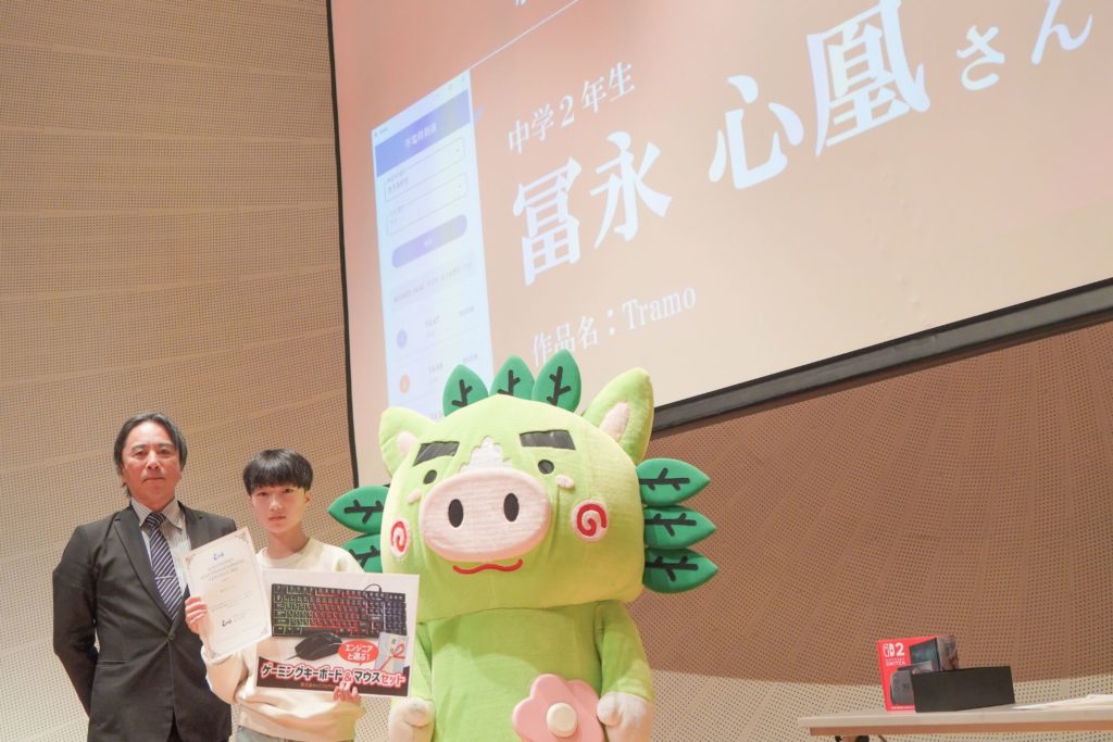 今年の総合グランプリ&知事賞は、人の役に立つアプリをしっかり考えて作り、プレゼンテーションもレベルが高かったと評価の高かった小学5年生の富田さん。